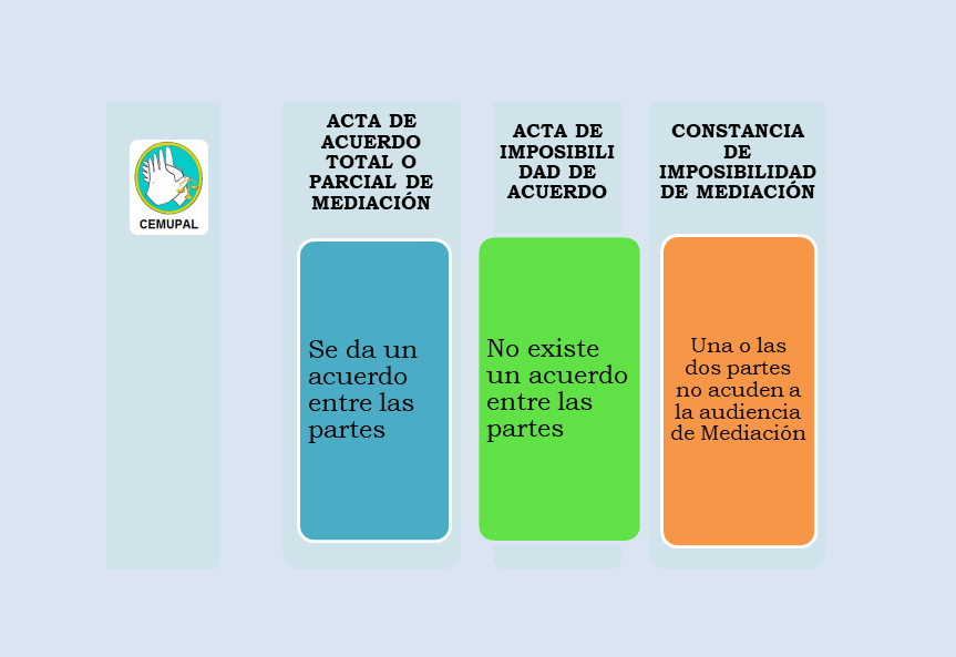 Acuerdo y constancia del acuerdo entre las partes: Se tiene que precisar con claridad los puntos del acuerdo, luego la forma que tiene que sellarse el acuerdo, pueda ser expresada verbal y a continuación por escrito en el acta de mediación que debe ser firmada por los intervinientes y por el mediador/a.